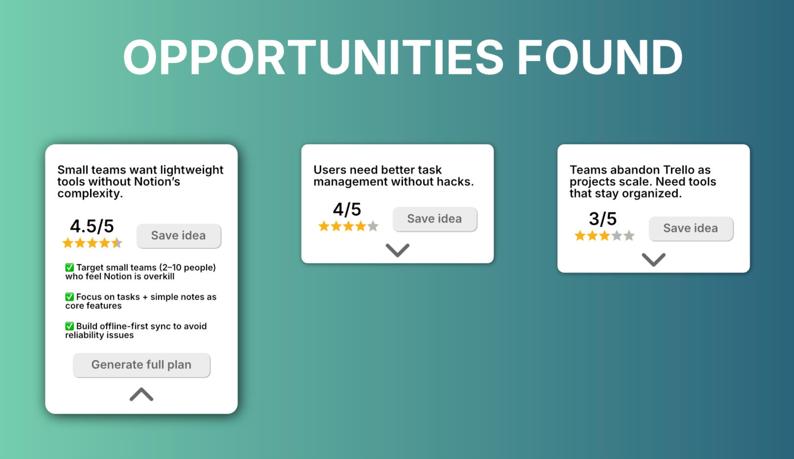 Scan the internet for real problems like "I wish there was a tool that…" and let AI turn them into startup ideas worth exploring.